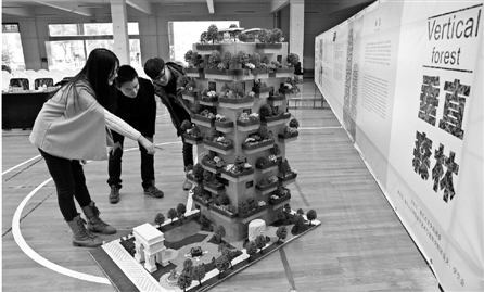 昨天,同样是植树节,根据布鲁内洛的理念,浙江万里学院15名大学生们制作了高达1米多的“垂直森林”模型,在该校的“绿色万里”开幕式上向全校师生展出。