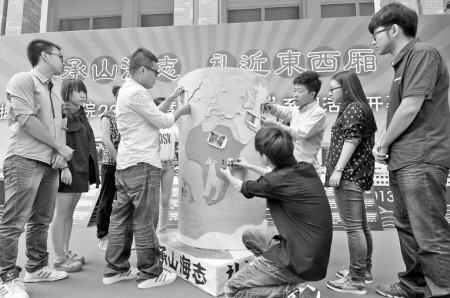 10月14日下午,浙江万里学院一个打着“地球仪”名号却有着圆柱体标准身材的神秘物体出现时,一大群同学围观了上来,在这个近一米八的圆柱体“地球仪”上,七彩斑斓的七大陆还张贴了一张张卫生整洁的寝室照片。