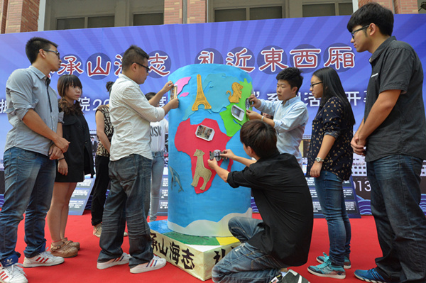 在当天下午举行的“国际万里”开幕式上,一个打着“地球仪”名号却有着圆柱体标准身材的神秘物体出现时,一大群同学围观了上来,在这个近一米八的圆柱体“地球仪”上,七彩斑斓的七大陆还张贴了一张张卫生整洁的寝室照片。