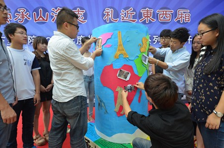 在14日下午举行的“国际万里”开幕式活动上,一个打着“地球仪”名号却有着圆柱体标准身材的神秘物体出现,吸引了大批同学的围观。这个近一米八的圆柱体“地球仪”上,七彩斑斓的七大陆还张贴了一张张卫生整洁的寝室照片。