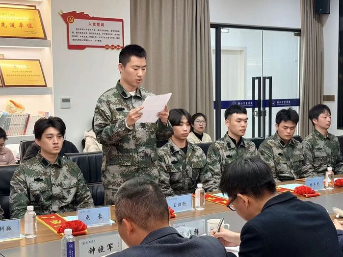 来自信息与智能工程学院的王沼衡作为新兵代表发言,他代表新兵郑重承诺:刻苦训练,努力学习,尽快完成从万里学子到优秀军人的转变;听党指挥、服从命令、团结战友,做一名政治合格、军事过硬的新时代革命军人;不辜负学校的培养,不辜负老师们的期望,用实际行动为军旗添彩,为母校争光!