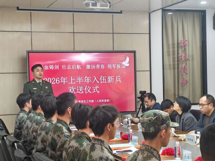 会上,学生工作部副部长陈清升首先通报了2026年上半年征兵工作情况,向光荣入伍的同学们表示热烈祝贺。结合“万里精神”与“军魂先锋者”的薪火相传,他向即将踏上军旅征程的新兵们寄语坚定理想信念,赓续“军魂先锋”的红色血脉,锤炼过硬本领,践行“恒志笃行”的万里品格的希望。